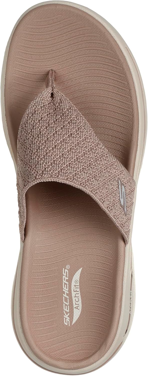 Warm weather days deserve Skechers GO WALK Arch Fit Sandal – Spellbound. This casual thong sandal features a shimmery knit upper, lightweight ULTRA GO cushioning, high-rebound Comfort Pillar technology, and a contoured floral Goga Mat footbed with podiatrist-certified Arch Fit support. Machine washable.